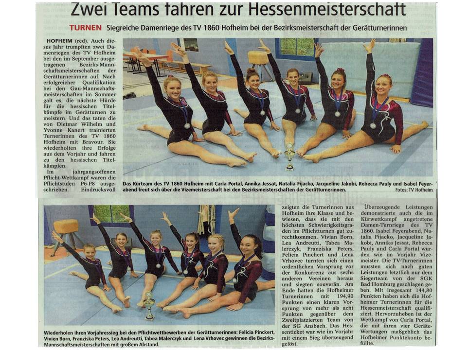 Zwei Hofheimer Damenriegen sicherten sich bei den Ende September in Frankfurt ausgetragenen Bezirksmeisterschaften die Fahrkarte für die hessischen Titelkämpfe im Gerätturnen. Die von Dietmar Wilhelm und Yvonne Kanert trainierten Turnerinnen des TV 1860 Hofheim hatten bei den Gau-Mannschaftsmeisterschaften im Sommer die erste Hürde zur Hessenmeisterschaft genommen und sich für die Bezirksmeisterschaften qualifiziert.