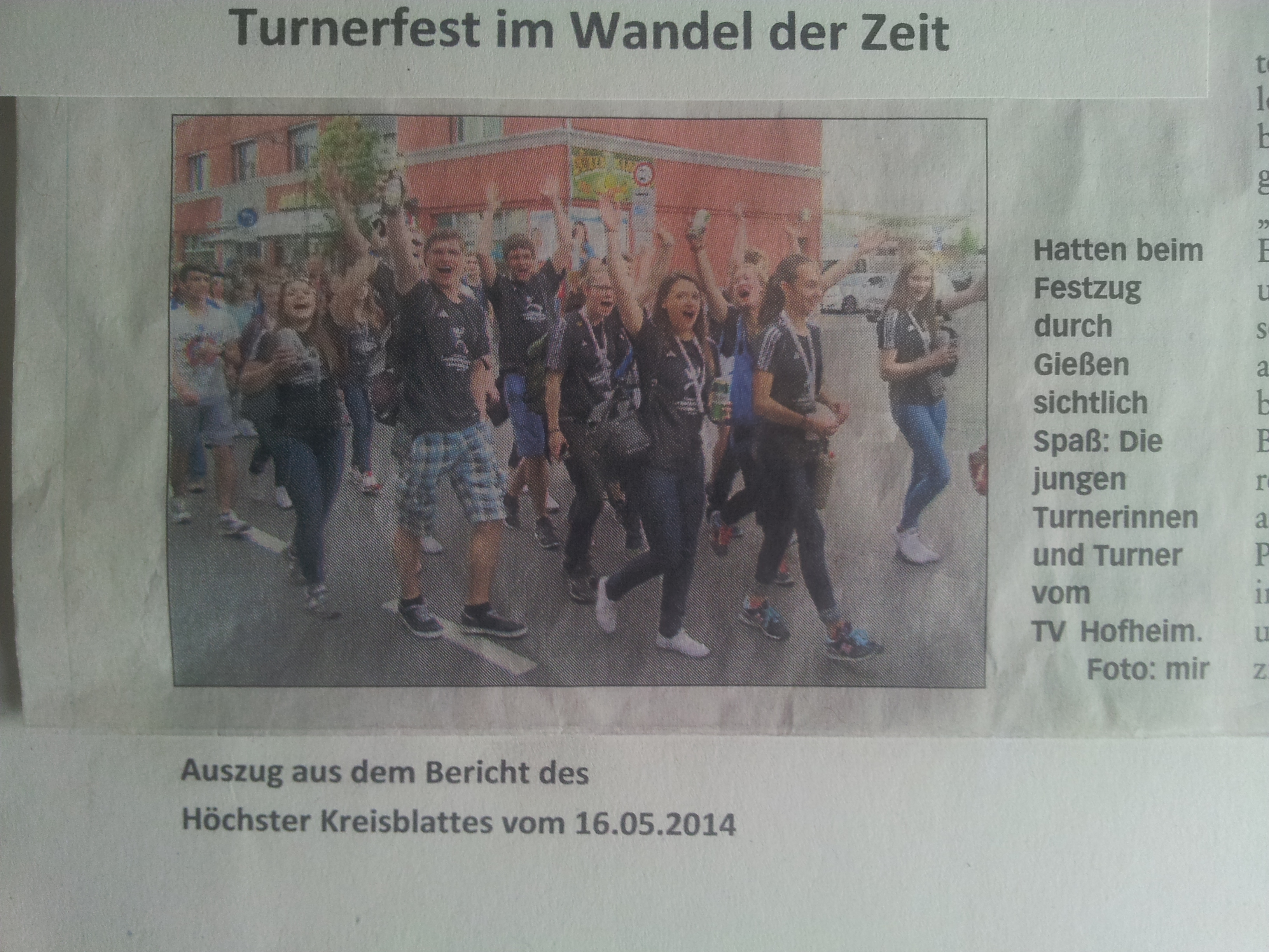 Unter dem Motto âWie bunt ist das denn!â stand die Pfingstwoche bei den Turnfans in Deutschland. Das abwechslungsreiche Programm des Internationalen Deutschen Turnfests zeigte die Vielseitigkeit des Turnens. Mitten im Geschehen waren rund 20 Turner des TV 1860 Hofheim, die die Turnfesttage in vollen Zügen genossen.